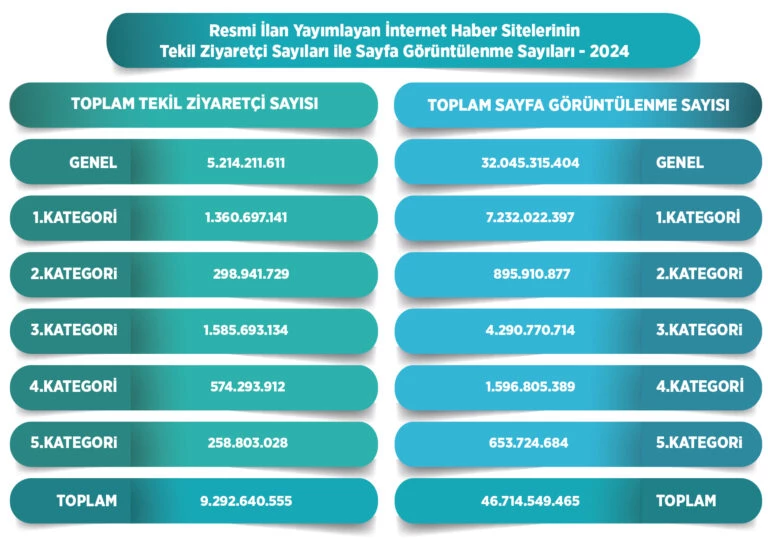 İnternet haber sitelerinde toplam 9.292.640.555 tekil ziyaretçi tarafından 46.714.549.465 adet sayfa görüntülenmesi gerçekleştirildi.