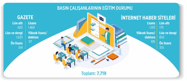 Basın çalışanlarının eğitim düzeyleri incelendiğinde ise yüzde 43,8 oranıyla büyük çoğunluğunun lisans seviyesinde eğitim gördüğü istatistiklere yansıdı. Bunu, yüzde 32,2 ile lise, yüzde 11,3 ile ön lisans, yüzde 10,1 ile lise altı, yüzde 2,6 ile de yüksek lisans ve doktora mezunu gazeteciler izledi.