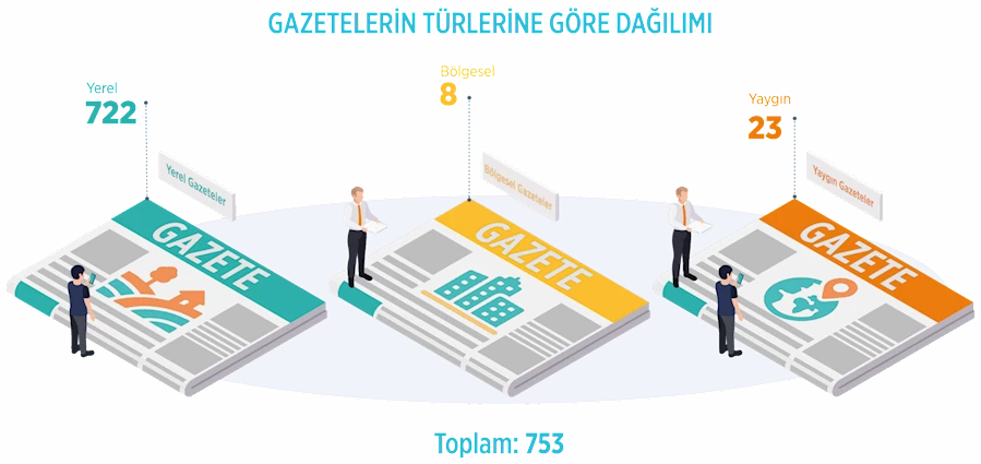 753 gazetenin yüzde 95,9’i yerel, yüzde 3’ü yaygın, yüzde 1,1’i ise bölgesel yayınlardan oluştu. Gazetelerin yayımlanma sıklığına bakıldığında ise 456’sının günlük, 297’sinin ise haftada 2 ila 6 gün arasında değişen periyotlarla yayımlandığı istatistiklere yansıdı.