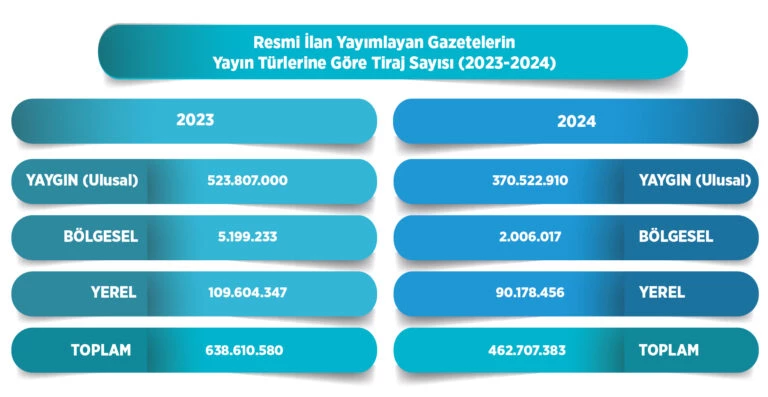 Gazetelerin toplam tirajı 2023 yılına göre yüzde 27,5 oranında düşüş göstererek 2024 yılında 462.707.383 olarak gerçekleşti.