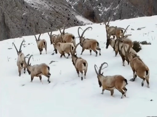 Niğde sınırlarındaki Aladağlar’da karlı zirvelerde dolaşan yaban keçileri dronla görüntülendi, ortaya büyüleyici manzaralar çıktı.