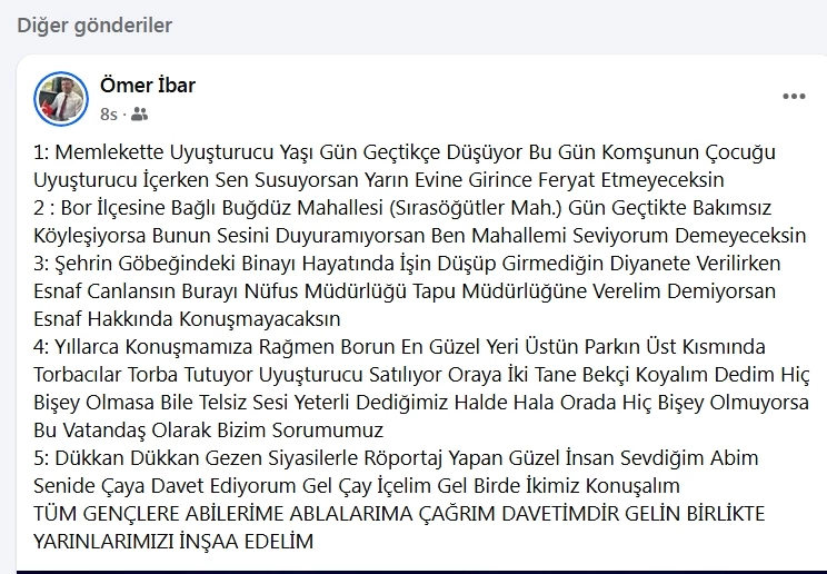 İbar, yaptığı açıklamada, “Bor’un en güzel yeri olan Üstün Park’ın üst kısmında torbacılar torba tutuyor, uyuşturucu satıyor” diyerek yetkililere çağrıda bulundu. Uzun süredir bu bölgeyle ilgili önlem alınmasını istediklerini belirten İbar, “Oraya iki bekçi koyalım dedik, hiç değilse telsiz sesi yeter dedik ama hâlâ hiçbir şey yapılmıyor” ifadelerini kullandı.