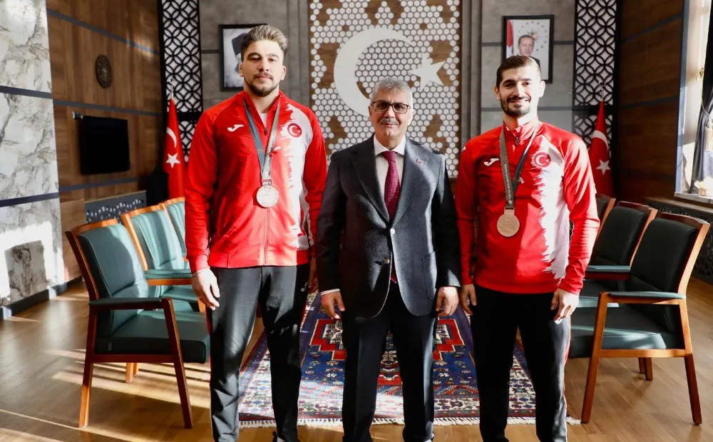 Ulusal ve uluslararası arenada elde ettikleri derecelerle Türk güreşinin gurur kaynakları arasında yer alan Niğdeli millî sporcular Ahmet Talha Kacur ve Kadir Kuş, Deaflympics Olimpiyat Oyunları’nda kazandıkları bronz madalyaların ardından Niğde Valisi Cahit Çelik’i makamında ziyaret etti.