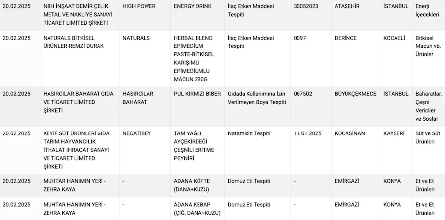 Taklit veya Tağşiş Yapılan Gıdalar Listesine yeni ürünler eklendi. Demlik Çayda gıda boyası tespit edilirken kekik de ise yabancı madde tespiti yapıldı. Kırmızı tatlı toz biberin içerisinde domates eritme peynir de bitkisel yağ tespit edilirken piliç sucukta kanatlı eti, kasap köfte de ise taşlık, kalpte sakatat balda ise taklit yapıldığı belirtildi.