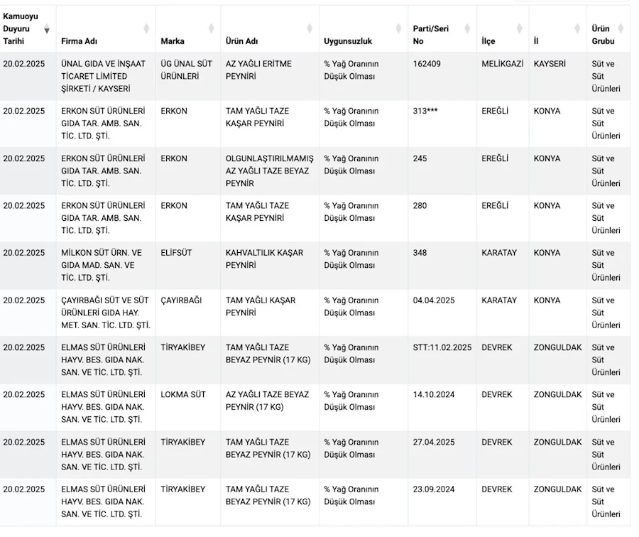 Taklit veya Tağşiş Yapılan Gıdalar 2 listesine 18 yeni ürün eklenerek ürün sayısı 81'e yükseldi. Eritme peynire, kaşar peynire, beyaz peynire ve tost peynirine düşük yağ oranı tespiti yapıldı.