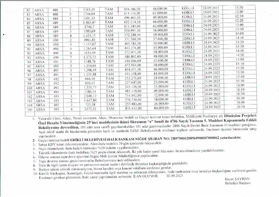 Geçici teminat bedeli, Edikli Belediyesi’nin Halkbank Niğde Şubesi’ndeki hesabına yatırılacak.