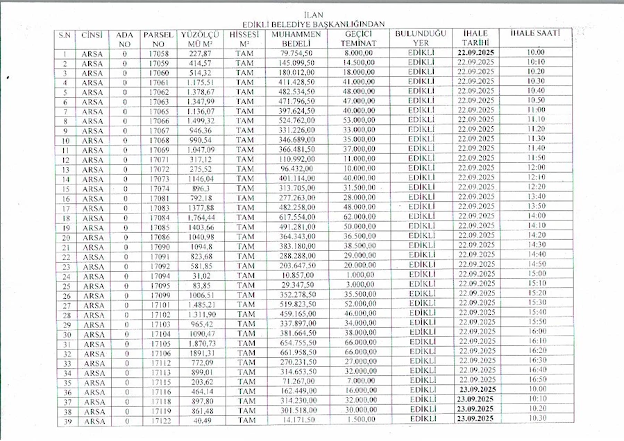 Belediyeden yapılan açıklamaya göre ihaleler, belirtilen tarih ve saatlerde Edikli Belediyesi Encümen Toplantı Salonu’nda yapılacak.