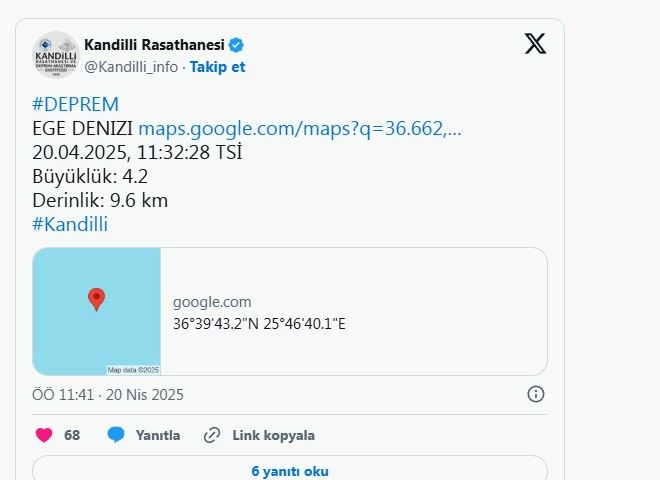 İçişleri Bakanlığı Afet ve Acil Durum Yönetimi Başkanlığı (AFAD), Ege Denizi'nde 12 Adalar Bölgesi'nde 4.2 büyüklüğünde bir depremin meydana geldiğini duyurdu.