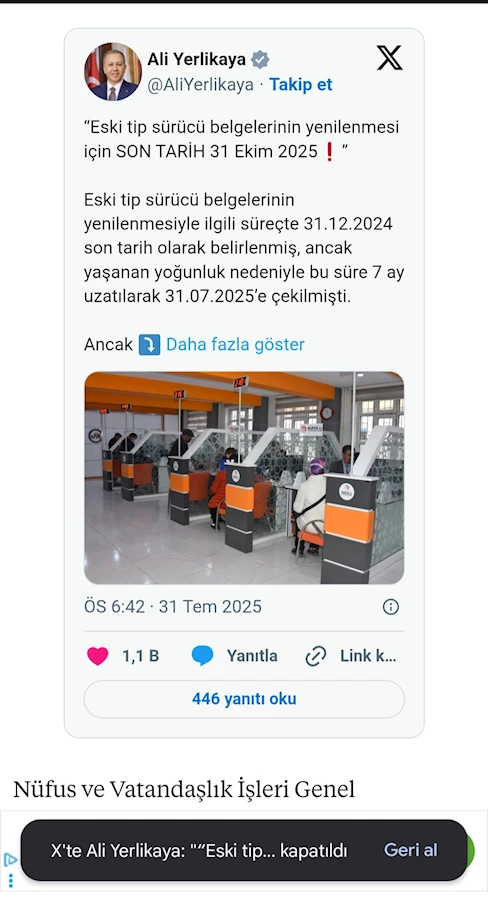 ARTIK UZATMA OLMAYACAK. Son tarih: 31 Ekim 2025.” ifadelerini kullandı. Öte yandan, Nüfus ve Vatandaşlık İşleri Genel Müdürlüğü, eski tip ehliyetlerin 31 Temmuz’a kadar indirimli olarak 15 TL karşılığında yenilenebileceğini açıklamıştı.