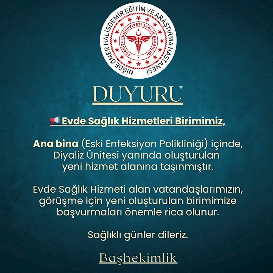 Niğde Eğitim ve Araştırma Hastanesi Başhekimliğinden konuyla ilgili yapılan duyuruda, “Evde Sağlık Hizmetleri Birimimiz, Ana bina (Eski Enfeksiyon Polikliniği) içinde, Diyaliz Ünitesi yanında oluşturulan yeni hizmet alanına taşınmıştır.
