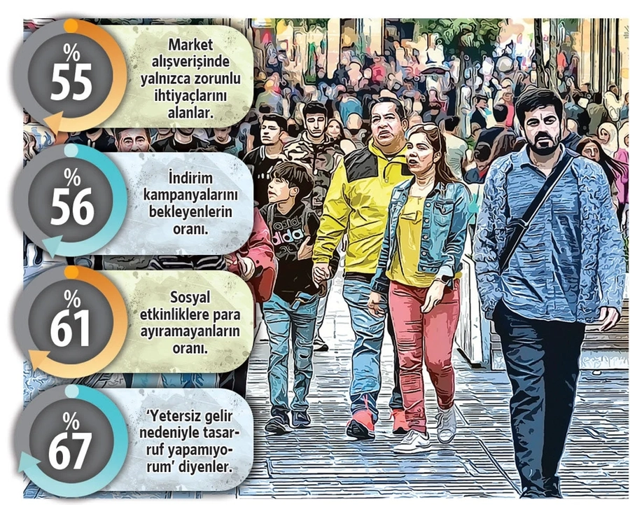 Araştırma, vatandaşların harcama alışkanlıklarındaki daralmayı da gözler önüne serdi. Market alışverişlerinde vatandaşların yüzde 55’i yalnızca zorunlu ihtiyaçlarını aldığını söylerken, yüzde 56’sı indirim kampanyalarını beklediğini belirtti. Sosyal yaşamda da durum farklı değil. Katılımcıların yüzde 61’i ‘tiyatro, konser gibi etkinliklere para ayıramıyorum’ derken yüzde 54’ü ise maddi sıkıntılar nedeniyle sosyal hayatını ertelemek zorunda kaldığını ifade etti