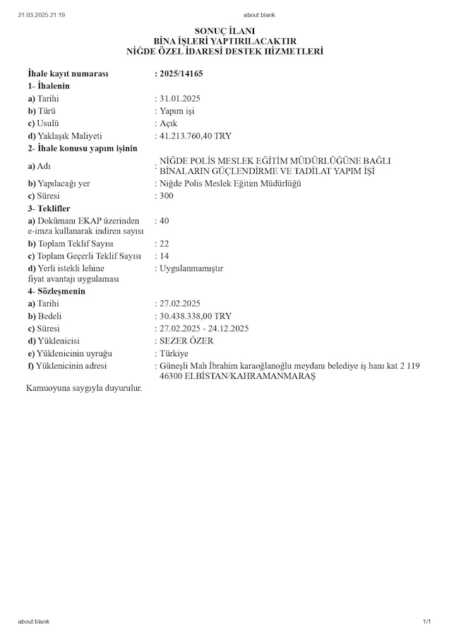 31 Ocak 2025 tarihinde Niğde Polis Okulu Güçlendirme ve Tadilatı ihalesi yapıldı.  Sözleşme işe başlama tarihi 27 Şubat 2025   ihale bitim tarihi ise 24 Aralık 2025 olarak 300 gün belirlendi.