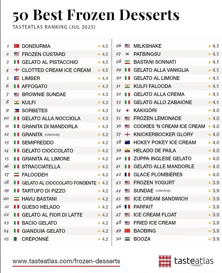 Listenin ikinci sırasında ABD’den “Frozen Custard” yer alırken, üçüncü sırada İtalya’nın meşhur “Fıstıklı Gelato”su bulunuyor. Toplamda 50 farklı soğuk tatlının yer aldığı listede Türkiye yalnızca Maraş dondurmasıyla temsil edilirken, İtalya ise çeşitli gelato türleriyle dikkat çekti.