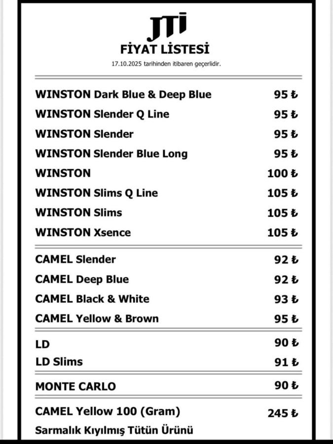 JTI grubu sigaralara 17 Ekim 2025 tarihinden itibaren geçerli olmak üzere zam yapıldı. Yeni fiyat listesine göre Winston markasının bazı çeşitleri 95 liradan, Slender ve Slims serileri ise 105 liradan satılacak. Camel grubunda fiyatlar 92 ila 95 lira arasında değişirken, LD markalı sigaralar 90-91 lira aralığında olacak. Monte Carlo 90 liradan satışa sunulacak.