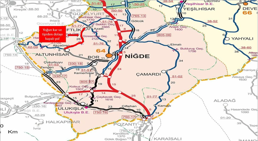 Açıklamaya göre, 51-76 Kontrol Kesim Numaralı Niğde-Çiftlik İl Yolu’nun 8+000 ile 30+000 kilometreleri ile 51-78 Kontrol Kesim Numaralı Çiftlik-Altunhisar II Yolu’nun 32+000 ile 56+000 kilometreleri, 12 Ocak 2026 saat 23.30 itibarıyla vatandaşların güvenliği amacıyla ulaşıma kapatıldı.