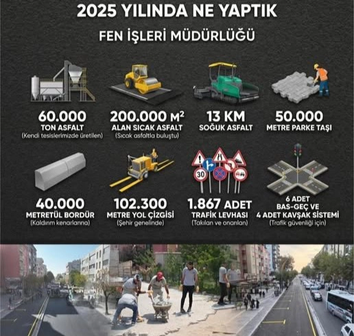 Belediye verilerine göre, Fen İşleri Müdürlüğü ekipleri tarafından kendi tesislerinde üretilen 60 bin ton asfalt kullanılarak şehir genelinde yol yapım ve onarım çalışmaları gerçekleştirildi. Ayrıca 200 bin metrekare sıcak asfalt serimi yapılırken, 13 kilometre soğuk asfalt çalışması tamamlandı.