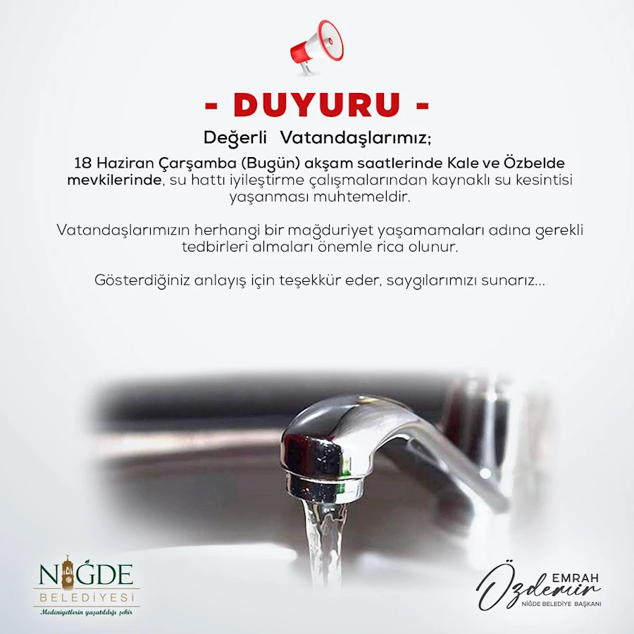 Niğde Belediyesi'nden yapılan duyuruda, "Değerli vatandaşlarımız, 18 Haziran Çarşamba (bugün) akşam saatlerinde Kale ve Özbelde mevkilerinde, su hattı iyileştirme çalışmalarından kaynaklı su kesintisi yaşanması muhtemeldir.