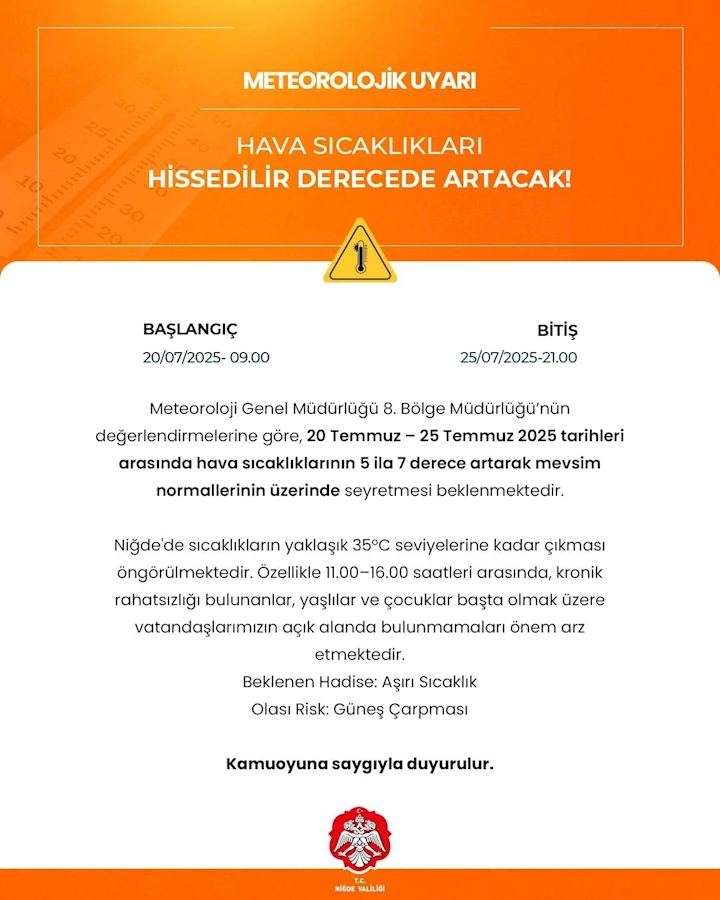 Beklenen hadise: Aşırı sıcaklık, Olası risk: Güneş çarpması,
