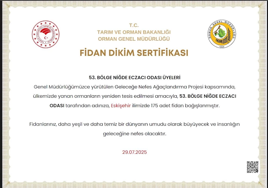 Niğde Eczacılar Odası, ülkemizdeki orman yangınlarının yarattığı tahribatı azaltmak ve doğanın yeniden yeşermesine katkıda bulunmak amacıyla başlatılan Geleceğe Nefes Kampanyası’na destek verdi.