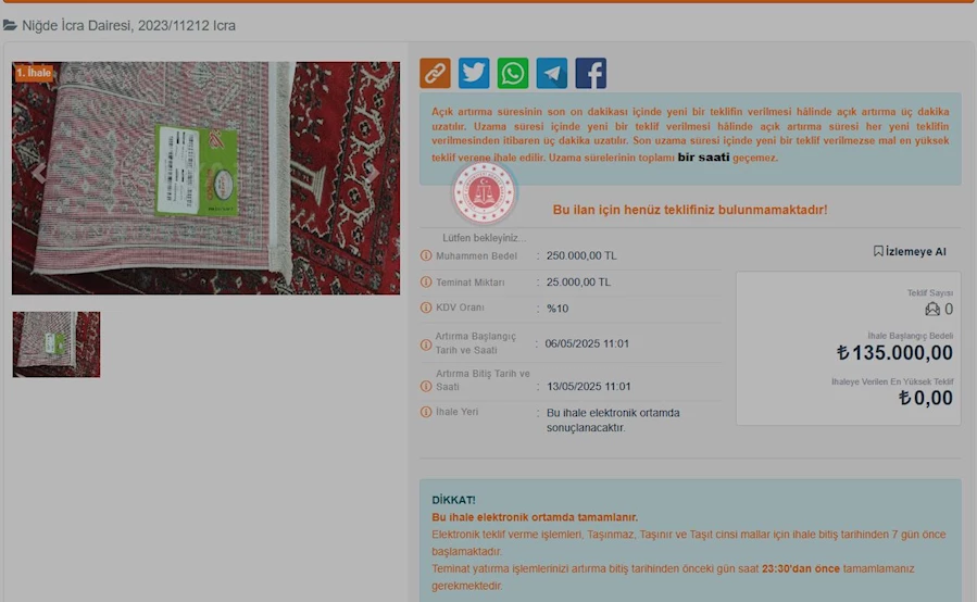 İlgilenen alıcılar, bu halaları UYAP Elektronik Satış Portalı (esatis.uyap.gov.tr) üzerinden teklif vererek satın alma fırsatı yakalayacaklar. Açık artırma iki aşamada gerçekleşecek. İlk artırma 6 Mayıs 2025 saat 11:01'de başlayıp 13 Mayıs 2025 saat 11:01'de sona erecek. Bu ilk artırmada geçerli bir teklifin verilebilmesi için, teklif edilen bedelin halıların muhammen değerinin en az yarısı ile satış masraflarını karşılaması gerekiyor.