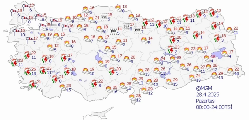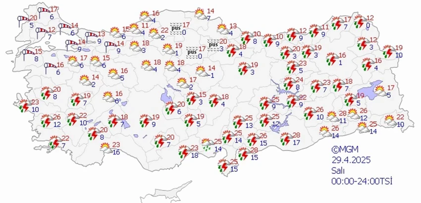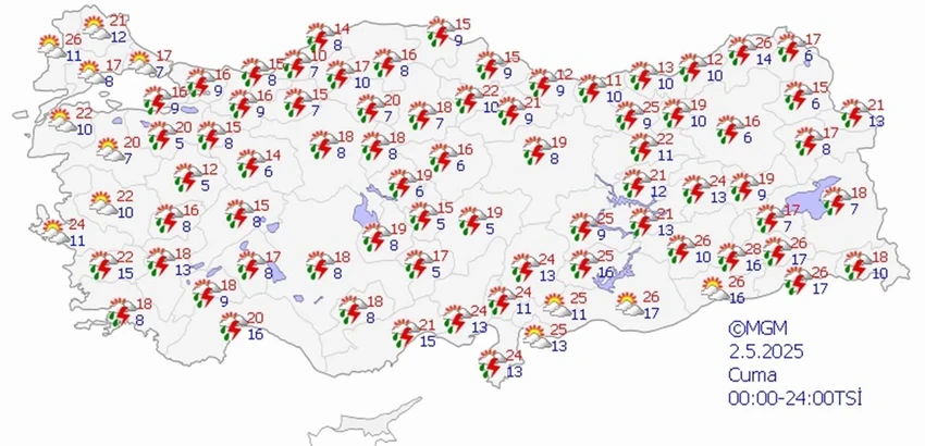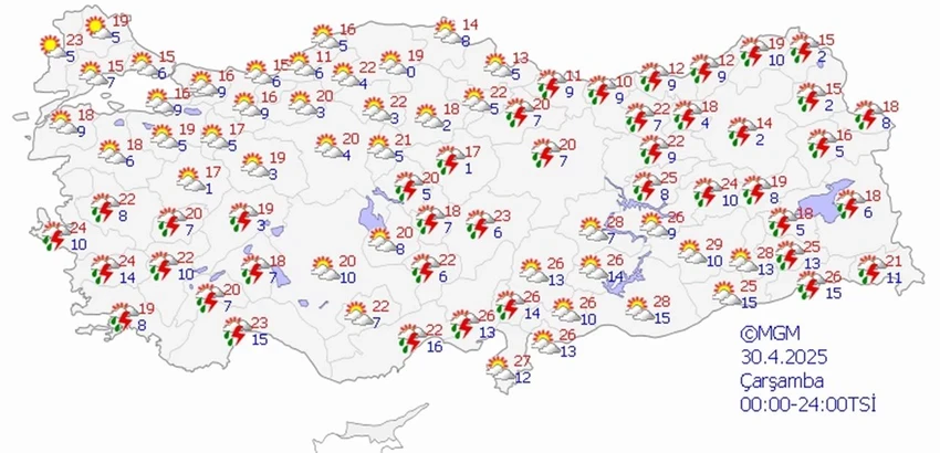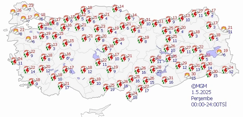 İç Anadolu’nun doğusunda, özellikle Niğde, Nevşehir, Aksaray, Kayseri ve Sivas’ın kuzey kesimlerinde; Doğu Akdeniz’de ise Mersin’in doğusu ile Adana çevresinde yerel ama geniş alanları etkileyen çok kuvvetli gök gürültülü fırtına bekleniyor.