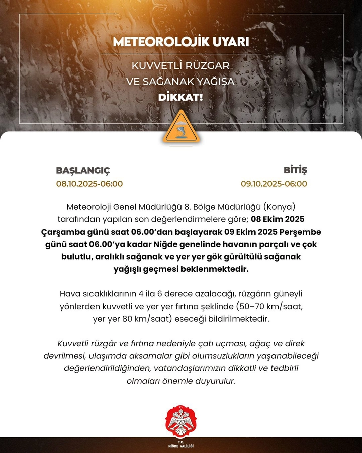 Niğde Valiliği, il genelinde etkili olması beklenen kuvvetli rüzgar ve sağanak yağış nedeniyle vatandaşları uyardı.