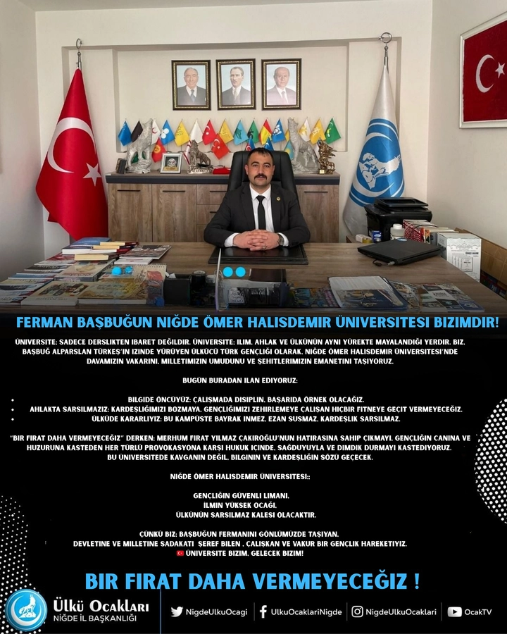 Niğde Ömer Halisdemir Üniversitesi’nin gençliğin güvenli limanı, ilmin yüksek ocağı ve ülkünün sarsılmaz kalesi olacağını belirten Babacan, “Biz, Başbuğ Alparslan Türkeş’in izinde yürüyen, devletine ve milletine sadakati şeref bilen, vakur bir gençlik hareketiyiz” dedi.