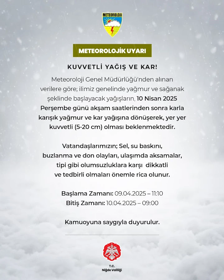 Niğde Valiliği’nden yapılan meteorolojik uyarıda, "Meteoroloji Genel Müdürlüğü'nden alınan verilere göre; ilimiz genelinde yağmur ve sağanak şeklinde başlayacak yağışların, 10 Nisan 2025 Perşembe günü akşam saatlerinden sonra karla karışık yağmur ve kar yağışına dönüşerek, yer yer kuvvetli (5-20 cm) olması beklenmektedir.
