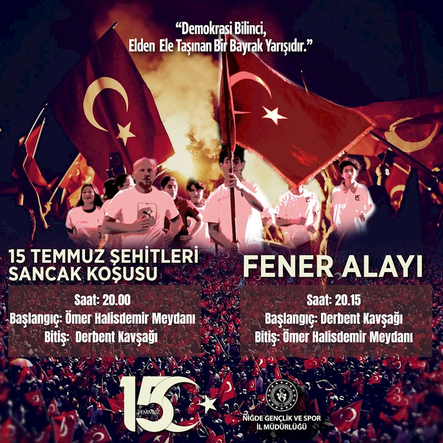 Aziz şehitlerimizi anmak, gazilerimize minnet duygularını ifade etmek ve milletin demokrasiye sahip çıkma kararlılığını vurgulamak amacıyla düzenlenen program kapsamında Sancak Koşusu ve Fener Alayı düzenlenecek.