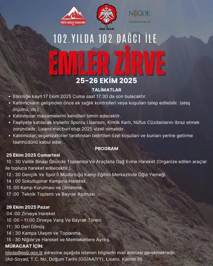 25–26 Ekim 2025 tarihlerinde, Aladağlar’ın 3.723 metre yüksekliğindeki Emler (Engin Tepe) Zirvesi’ne tırmanış gerçekleştirilecek. “102. Yılda, 102 Dağcı ile Emler Zirvesi” adıyla planlanan etkinlikte, sporcular Türk bayrağını zirvede dalgalandırarak Cumhuriyet coşkusunu doruklara taşıyacak.