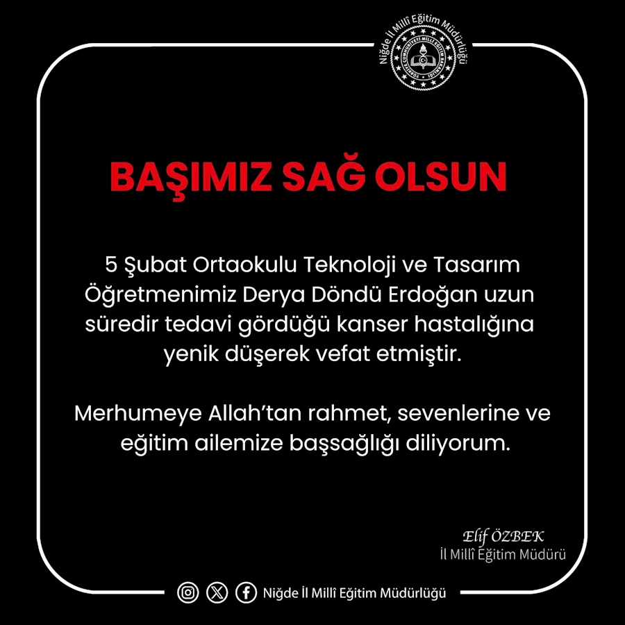 Niğde 5 Şubat Ortaokulu Teknoloji ve Tasarım Öğretmeni Derya Döndü Erdoğan uzun süredir tedavi gördüğü kanser hastalığına yenik düşerek hayatını kaybetti. Derya öğretmenin vefatı eğitim camiasında büyük üzüntü yarattı.