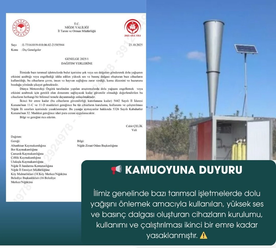 Niğde İl Tarım ve Orman Müdürlüğü, dolu yağışlarını önlemek amacıyla kullanılan yüksek ses ve basınç dalgası üreten cihazların kullanımını yasakladı. 2025/1 nolu Genelge ile yürürlüğe giren karara göre, il sınırları içerisinde bu tür cihazların kurulumu, kullanımı ve çalıştırılması ikinci bir emre kadar durduruldu.
