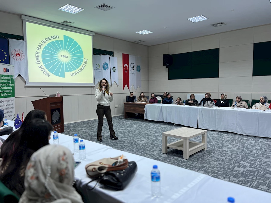 Niğde’nin beldelerinden ve kadın kooperatifleri üyelerinden oluşan 103 kadının katılımıyla gerçekleşen eğitim, Niğde Ömer Halisdemir Üniversitesi Kongre ve Kültür Merkezi'nde gerçekleştirildi. İklim değişikliği ile mücadele ve kuraklığa karşı adaptasyonun öneminin vurguladığı eğitimde, kırsal bölgelerdeki üreticilerin ekonomik gücünü koruyabilmesi için susuz tarım teknikleri ve tıbbi aromatik bitki yetiştiriciliği üzerine bilgiler paylaşıldı.