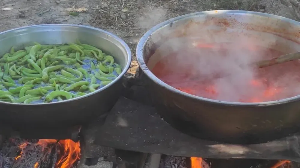 Niğdeli kadınlar, bahçelerine kurdukları büyük kazanlarda ev yapımı salça hazırlıklarının ardından acılı sos yapımına başladılar. El emeğiyle yapılan bu lezzet hem kış sofralarını süslüyor hem de aileleri bir araya getiren keyifli bir gelenek haline geliyor.