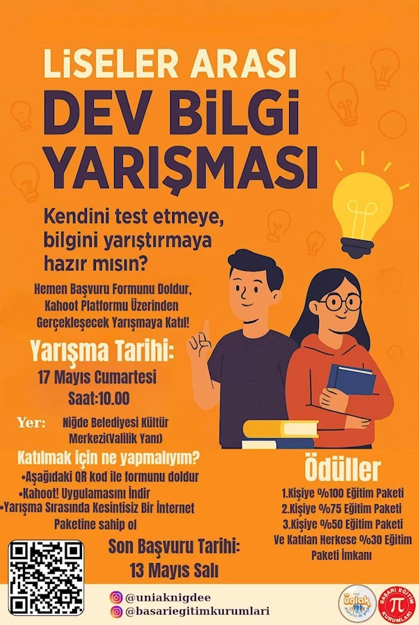Katılımın ücretsiz olduğu bu anlamlı etkinliğe Niğde'deki tüm liseli öğrencilerin davetli olduğu belirtildi. Yarışmaya katılmak isteyen öğrencilerin, ilgili afişte yer alan başvuru formunu doldurmaları ve yarışma günü Kahoot uygulamasını mobil cihazlarına indirerek internet bağlantısına sahip olmaları gerektiği vurgulandı.