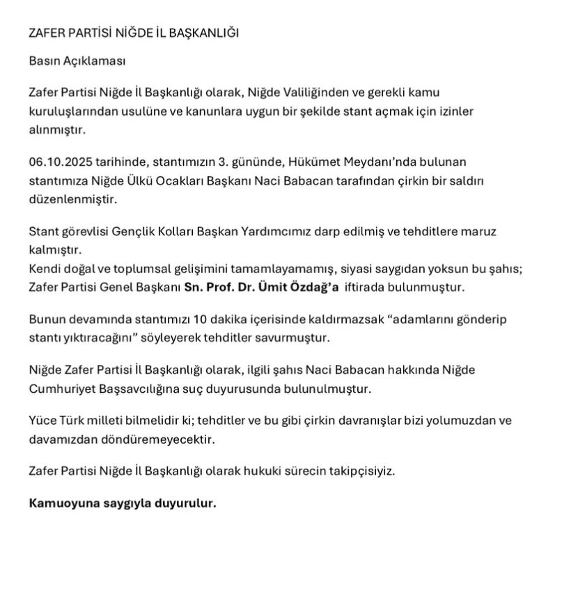 Zafer Partisi Niğde İl Başkanlığı tarafından yapılan basın açıklamasına göre, partinin yasal izinlerle Hükümet Meydanı'nda kurduğu tanıtım standı, 06 Ekim 2025 tarihinde bir saldırıya uğradı. Açıklamada, saldırıyı gerçekleştirdiği iddia edilen kişinin Niğde Ülkü Ocakları Başkanı Naci Babacan olduğu belirtildi.