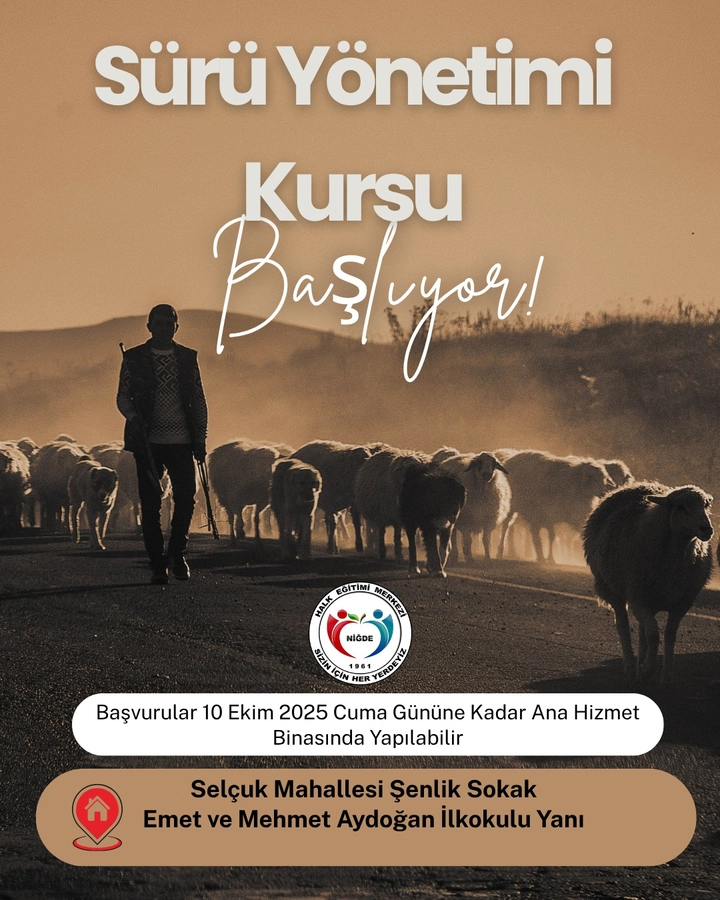 Niğde Halk Eğitimi Merkezi, hayvancılıkla ilgilenen vatandaşlar için “Sürü Yönetimi Kursu” düzenliyor. Kurs, 11 Ekim 2025 Cumartesi günü başlayacak.