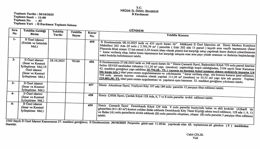 Encümenin 455 sayılı kararında, mülkiyeti İl Özel İdaresine ait 202 ada 20 parsel numaralı taşınmazın satışına ilişkin ihale süreci başlatılırken, imar planında söz konusu arsanın ticaret alanı olarak, blok nizam 12 kat ve emsal 2,50 şeklinde planlandığı belirtildi.
