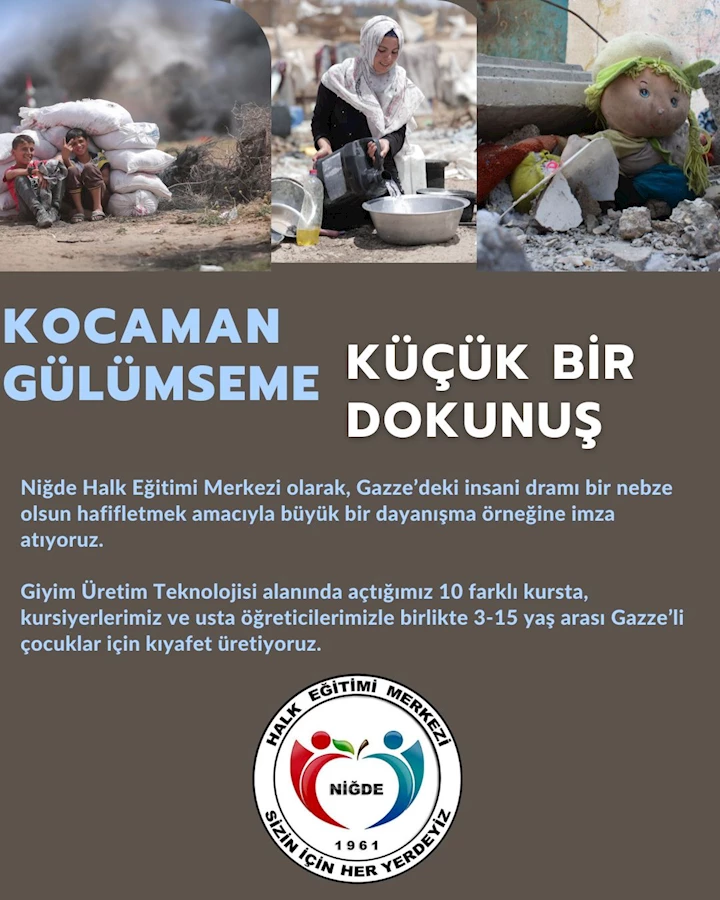 Toplamda 1000 çocuğa ulaşmayı hedefleyen projede; tüm üretim, malzeme temini ve paketleme süreçleri Niğde Halk Eğitimi Merkezi ve destekçiler tarafından yürütülüyor. Hazırlanan kıyafetler yaş ve cinsiyete göre gruplandırılarak Kızılay, İHH ve AFAD gibi yardım kuruluşları aracılığıyla Gazze’ye gönderilecek.