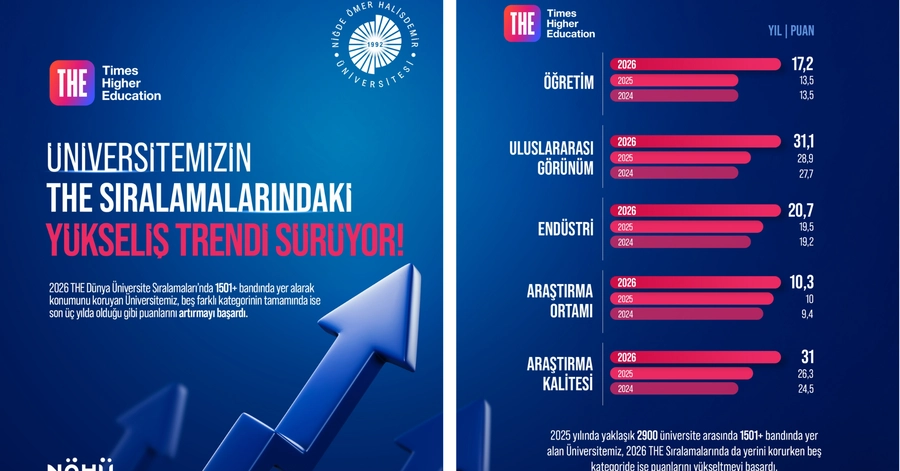 NÖHÜ, ilk kez dahil olduğu 2024 yılı THE Dünya Üniversite Sıralaması’ndan bu yana yükselişini sürdürerek, 2025 ve 2026 yıllarında da başarı grafiğini istikrarlı bir şekilde yukarı taşıdı.