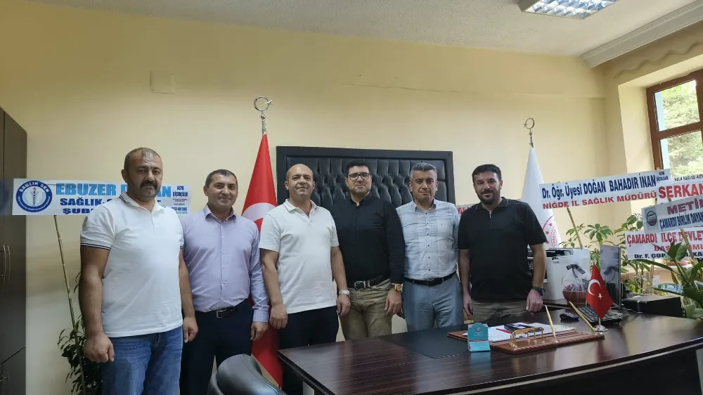 Sağlık-Sen Niğde Şube Başkanı Ebuzer Doğan ve yönetim kurulu üyeleri, Niğde İl Sağlık Müdürlüğü Sağlık Hizmetleri Başkanlığı görevine atanan Dr. Harun Yardımcı ile 112 Başhekimi olarak görevlendirilen Dr. Anıl Dönmez’e hayırlı olsun ziyaretinde bulundu.