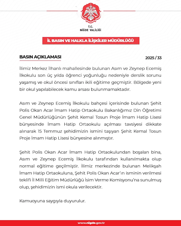 Niğde Valiliği’nden konu hakkında yapılan bilgilendirmede, “İlimiz Merkez İlhanlı mahallesinde bulunan Asım ve Zeynep Ecemiş İlkokulu son üç yılda öğrenci yoğunluğu nedeniyle derslik sorunu yaşamış ve okul öncesi sınıfları ikili eğitime geçmiştir. Bölgede yeni bir okul yapılabilecek kamu arsası bulunmamaktadır.