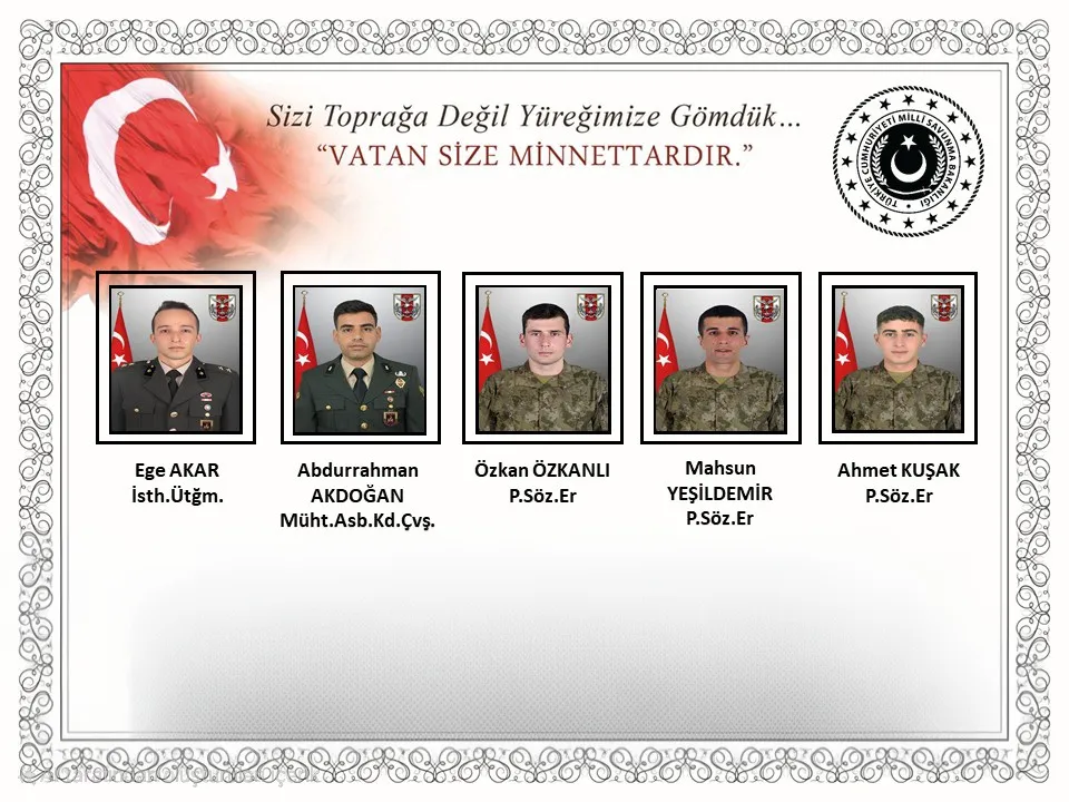 Şehitlerimize Allah'tan rahmet, kederli ailelerine, Türk Silahlı Kuvvetleri'ne ve aziz milletimize başsağlığı dileriz.