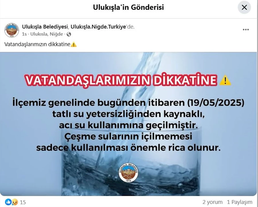 Ulukışla Belediyesi, bugün yaptığı bir duyuruyla ilçe genelinde çeşme suyunun içilmemesi gerektiğini bildirdi. Yapılan açıklamada, "Vatandaşlarımızın dikkatine, ilçemiz genelinde bugünden itibaren (19.05.2025) tatlı su yetersizliğinden kaynaklı acı su kullanımına geçilmiştir. Çeşme sularının içilmemesi, sadece kullanılması önemle rica olunur" denildi.