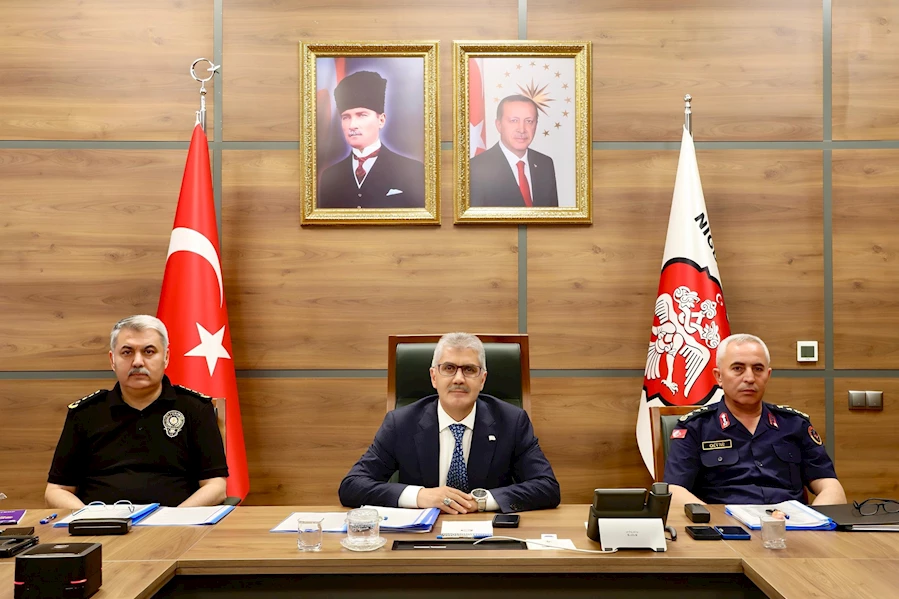 İçişleri Bakanı Ali Yerlikaya başkanlığında Video Konferans Sistemi (VKS) üzerinden toplantı gerçekleştirildi. İçişleri Bakanı Ali Yerlikaya başkanlığında gerçekleştirilen 19 ilin valileri, il emniyet müdürleri ve il jandarma komutanlarının katılımıyla Video Konferans Sistemi üzerinden düzenlenen toplantıya katılan Niğde Valisi Cahit Çelik’e İl Emniyet Müdürü Yılmaz Delen ve İl Jandarma Komutanı J. Alb. Gürol Okyar eşlik etti.