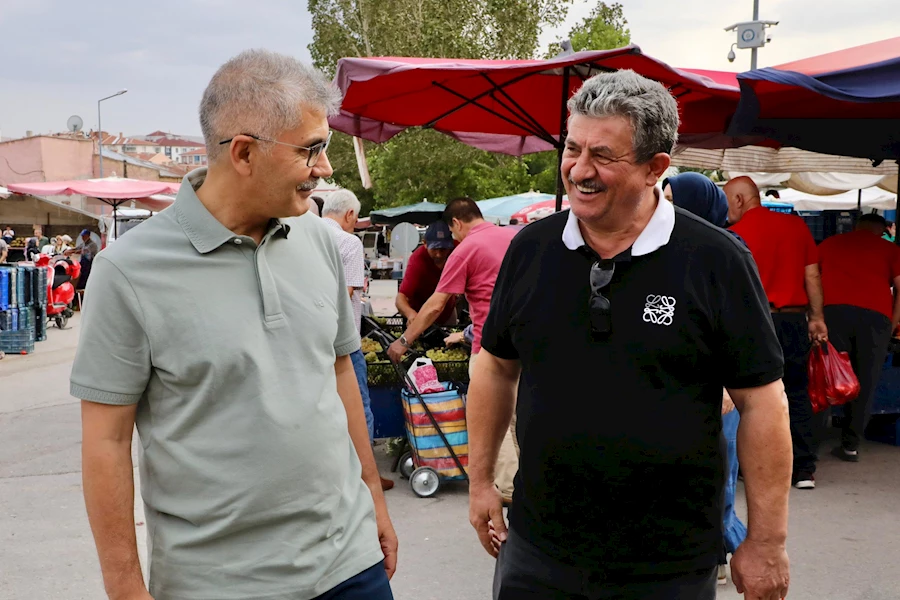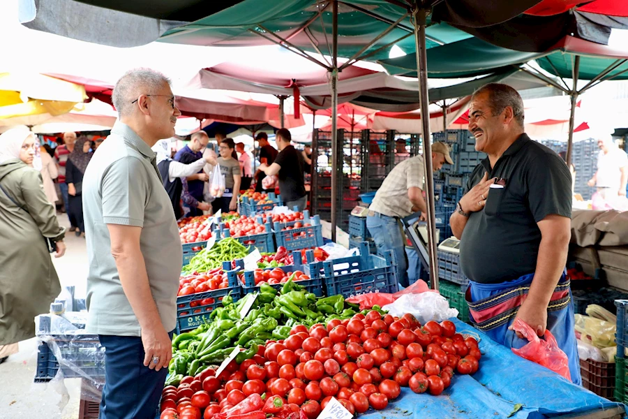 Pazar tezgâhlarını tek tek gezen Vali Çelik, esnafın sorunlarını dinledi, vatandaşlarla sohbet etti ve alışveriş yaptı.