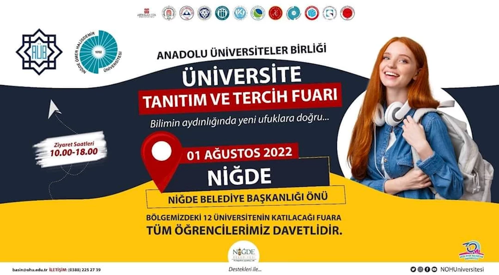 Niğde Ömer Halisdemir Üniversitesi Rektörü Prof. Dr. Hasan Uslu, Anadolu’daki 13 Üniversitenin katılımıyla Niğde’de 1 Ağustos 2022 Pazartesi Günü saat 10:00 ile 18:00 arasında tanıtım ve tercih fuarı düzenleyeceğini duyurdu.