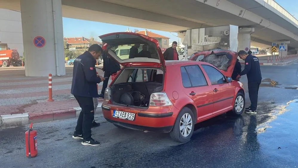 Yangın, sabah saatlerinde Hamidiye Mahallesi İbrahim Öktem Bulvarı üzerindeki köprülü kavşakta meydana geldi. Edinilen bilgiye göre, 42 AEB 829 plakalı Volkswagen marka otomobil seyir halindeyken kavşak içerisinde motor kısmından bir anda alev aldı. Durumu fark eden sürücü, aracı durdurarak 112 Acil Çağrı Merkezi'nden yardım istedi. O sırada devriye gezen Asayiş Şube Müdürlüğü Cinayet Büro Amirliği ekibi, yanan aracı fark ederek yangın tüpüyle alevlere müdahale etti. Polis ekiplerinin hızlı müdahalesi sayesinde alevler tüm aracı sarmadan kontrol altına alındı. Daha sonra olay yerine gelen itfaiye ekipleri LPG'li aracın gaz bağlantısını keserek, soğutma çalışması yaptı. Motor kısmı yanan araçta maddi hasar meydana gelirken, yangının şarj dinamosunda kaynaklanan elektrik arızası sonucu çıktığı ihtimali üzerinde duruluyor.
