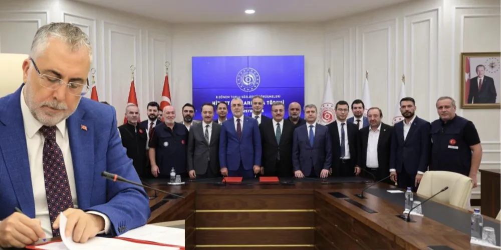 Çalışma ve Sosyal Güvenlik Bakanlığı başkanlığında hizmet kollarında yapılan anlaşmaya ilişkin imza töreni gerçekleştirildi. Törende konuşan Çalışma ve Sosyal Güvenlik Bakanı Vedat Işıkhan, sendikaların binden fazla talebi olduğunu belirterek, "Bu talepleri tasnif ettik. Siz sendika temsilcileri yoğun bir şekilde çalıştınız, Kamu İşveren Heyeti de yoğun bir mesai harcadı. Burada gerçekten de Saygıdeğer Cumhurbaşkanımızın liderliğinde Türkiye Yüzyılı’na yakışan bir çalışma hayatında kamu personelimizi güçlendirecek hem mali hem de sosyal hakları hayata geçirmiş olduk. Ben emek gösteren, destek veren -dün gece 01.30 gibi bitirdik toplantılarımızı- bu toplantılara katılan tüm arkadaşlarıma, hepinize teşekkür etmek istiyorum. Kamu Görevlileri Hakem Kurulundan çıkacak genele ilişkin artış oranları kararının da şimdiden hayırlı olmasını diliyorum" diye konuştu.