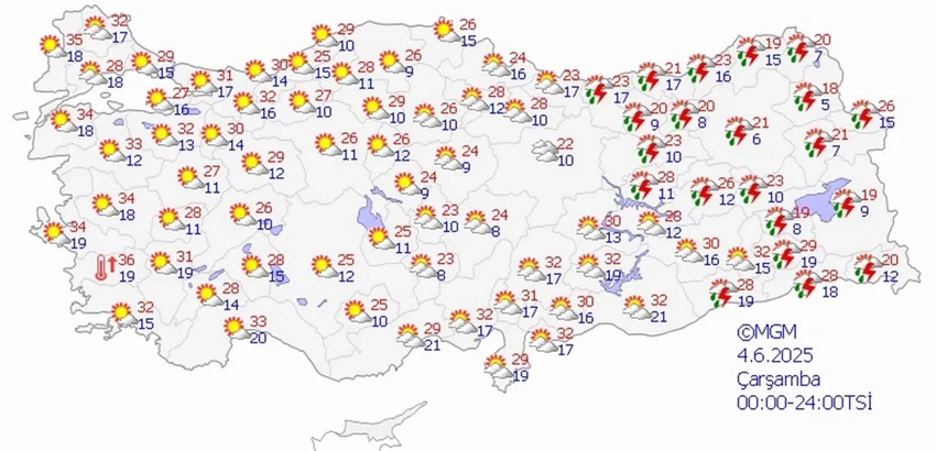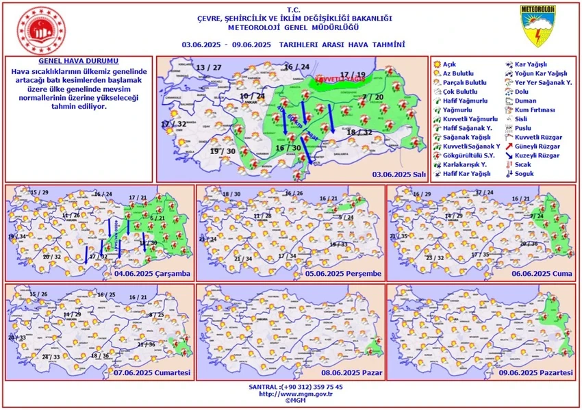 Meteoroloji’den alınan verilere göre ülkemizin iç ve doğu kesimleri parçalı ve yer yer çok bulutlu olacak. Orta Akdeniz’in Toroslar bölgesi, Doğu Akdeniz’in kuzey ve doğusu, İç Anadolu’nun doğusu, Orta ve Doğu Karadeniz, Doğu Anadolu’nun kuzeyi ile Van çevresi, Hatay’ın batısı, Konya’nın batısı, Malatya, Bitlis, Hakkari, Muş ve Bingöl çevrelerinde aralıklı sağanak ve gök gürültülü sağanak yağışların etkili olması bekleniyor.